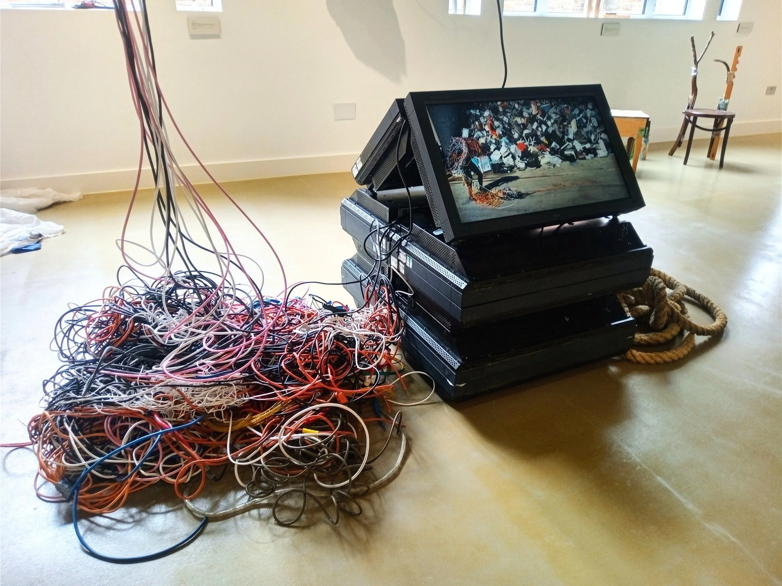 The Burden is an installation of filmed performances on discarded TV's. Performed with both electrical waste and rope waste from the sea. All materials were collected from La Collette Recycling Centre as they were being dumped.